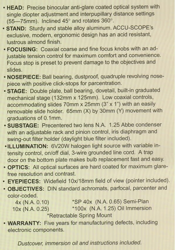 illumination circuitry and rugged mechanical movements. Accu-scope's 3004