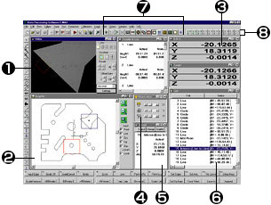 (2) Graphic window (3) D.R.O. window (4) Illumination window (5) Results window (6) List window (7) Caliper window (8) Measurement tool bar Note: You can display the output window, image window, or edit list window whenever necessary. |